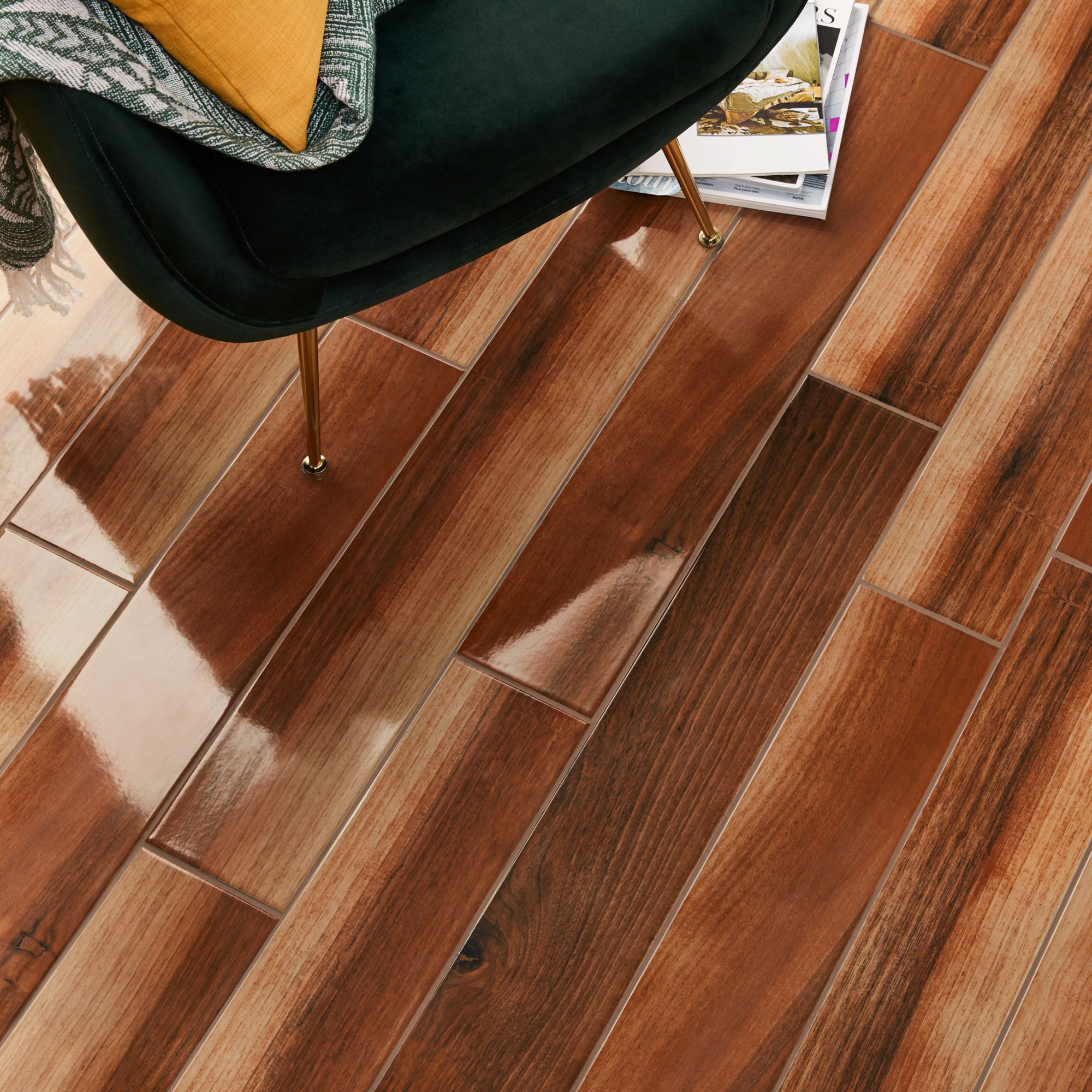 High Gloss Walnut High Gloss Wood Effect Ceramic Wall Floor Tile Pack Of 7 L 900mm W 150mm Diy At B Q